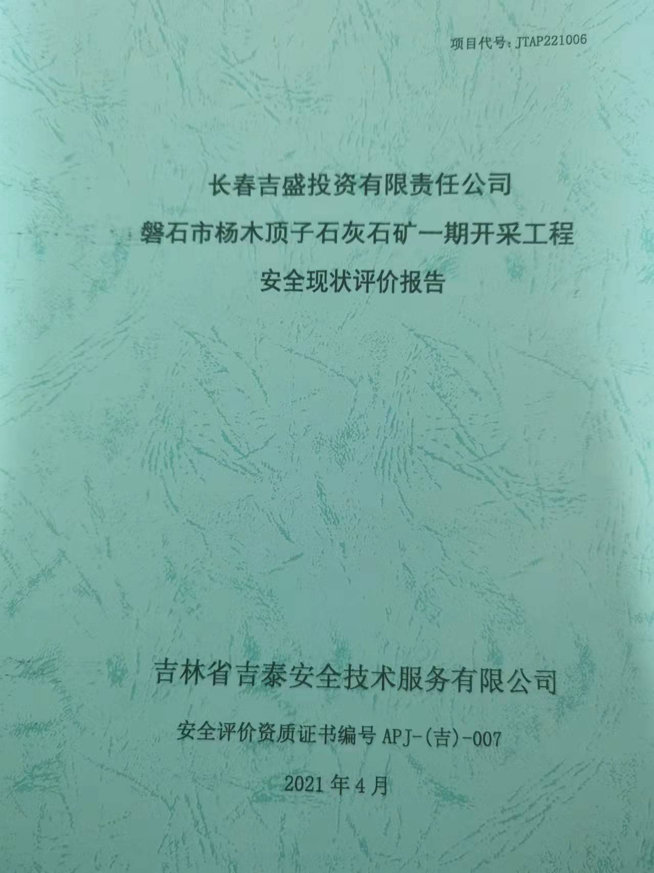 JTAP221006--長(zhǎng)春吉盛投資有限責(zé)任公司磐石市楊木頂子石灰石礦一期開采工...