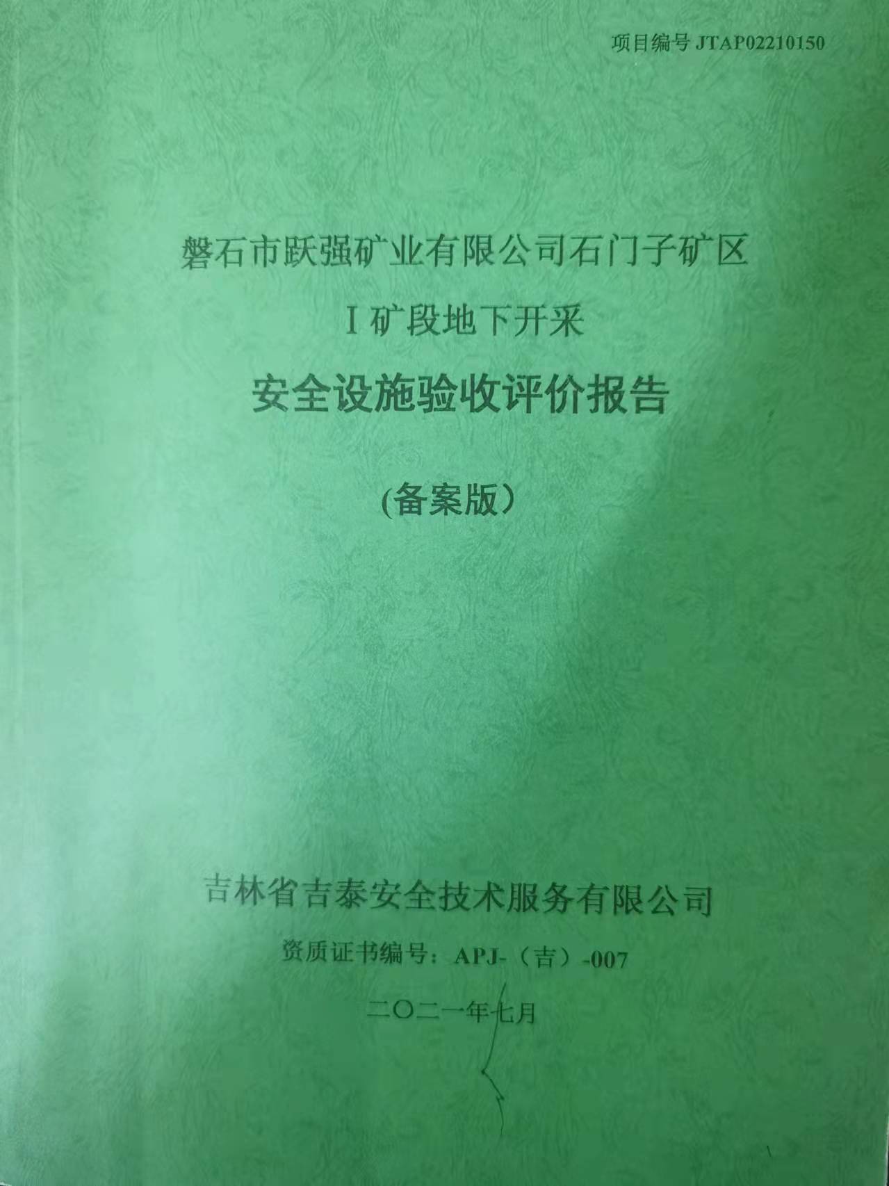 JTAP02210150--磐石市躍強(qiáng)礦業(yè)有限公司石門子礦區(qū)Ⅰ礦段地下開(kāi)采驗(yàn)收